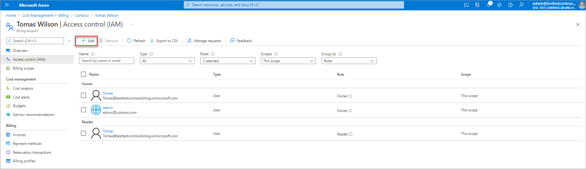 8. 在“添加权限”窗口中的“角色”列表内,选择“计费帐户所有者”。 在 “选择区域” 下,选择用户名,然后选择窗口底部的“ 添加 ”。