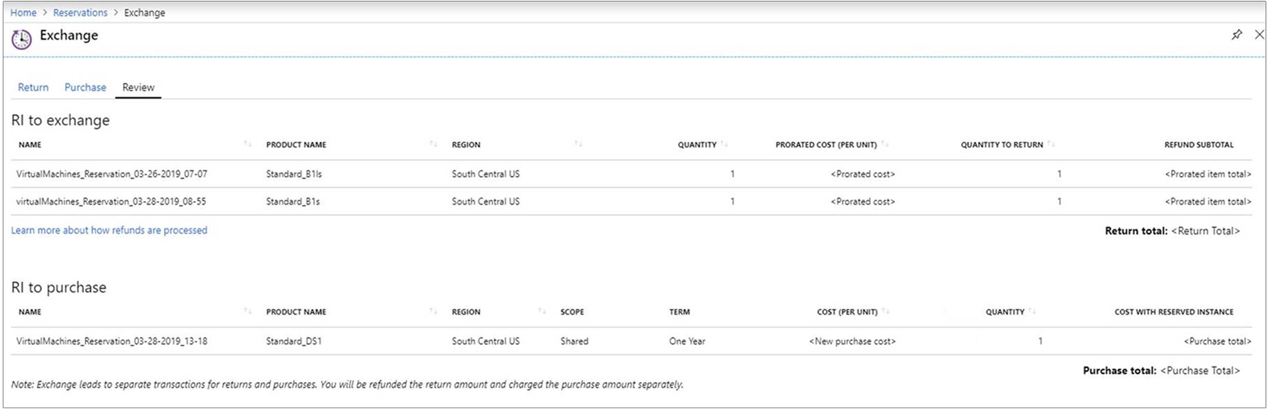 - 交易兑换被处理为退款和重新购买 - 为取消和新的预订购买创建不同的交易。 针对折价的预留按比例退回预留金额。 对于新的购买,您将按全价支付。 按比例分摊的预留金额是退回的预留的每日按比例分摊的剩余价值。