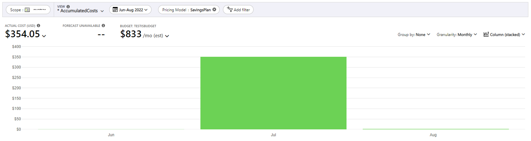 成本分析在默认视图中显示按月购买。 对“费用类型”应用“购买”筛选器,对“频率”应用“定期”筛选器,即可查看所有购买项。 若要仅查看节省计划,请应用“节省计划”筛选器。