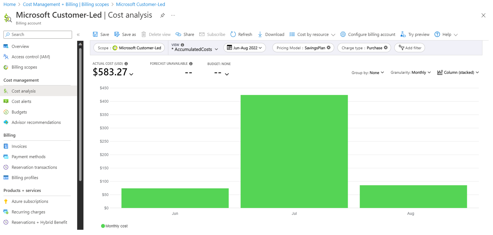 可以使用 API、使用情况数据和成本分析查看付款。 对于按月支付的节省计划,频率值在使用情况数据和节省计划费用 API 中显示为“重复”。 对于提前付款的节省计划,该值显示为“一次性”。