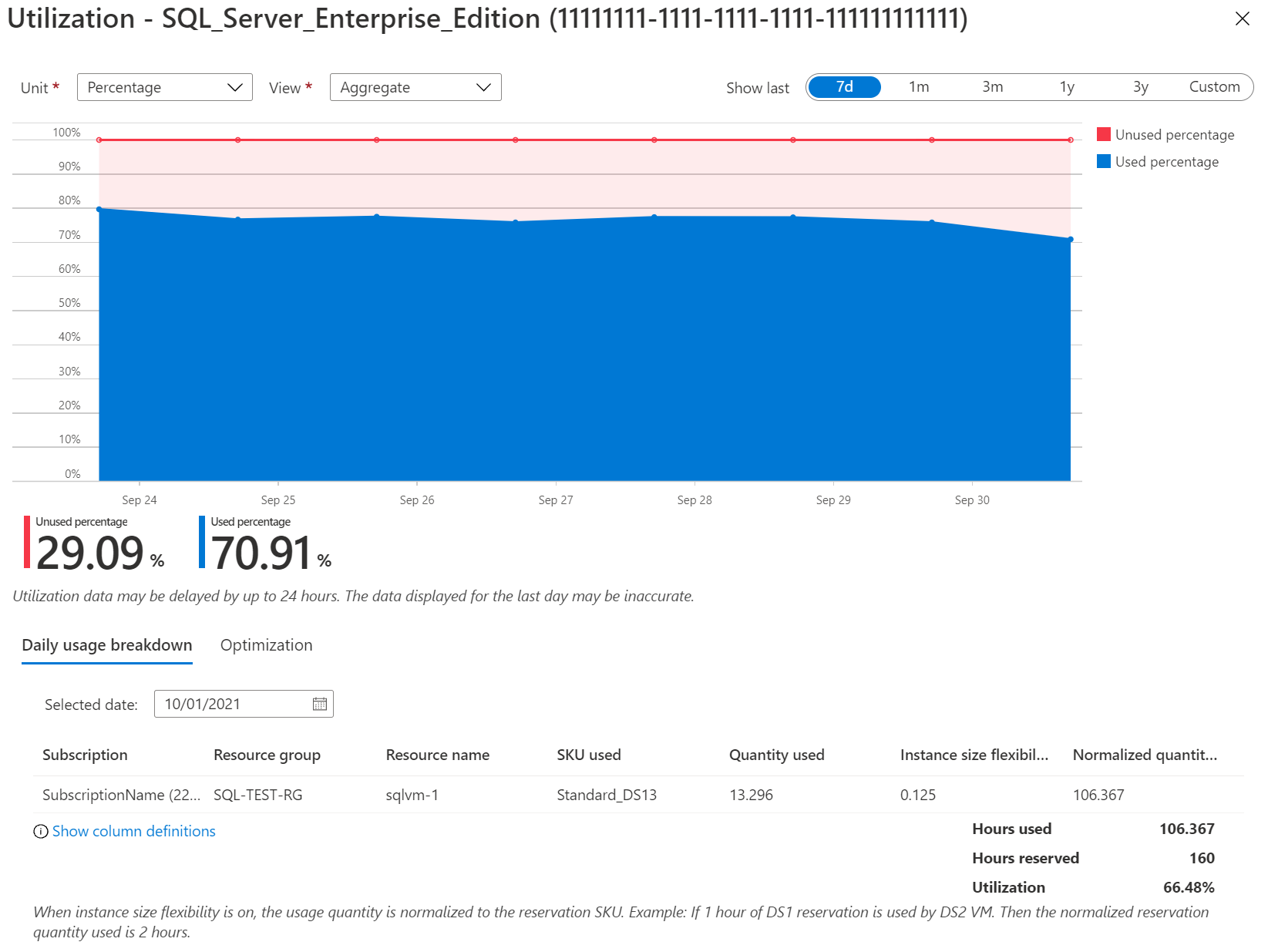 在 “最后一天利用率 ”或 “7 天利用率”下,选择一个百分比(可能为空或零),以便详细查看分配使用情况历史记录。
