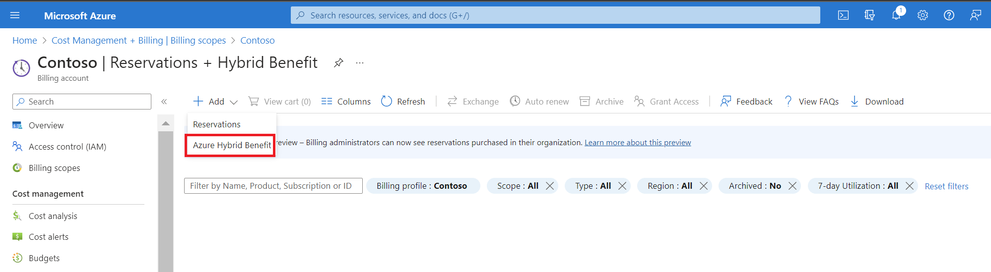 导航到 成本管理 + 计费 ,然后选择 “预留 + 混合权益”。