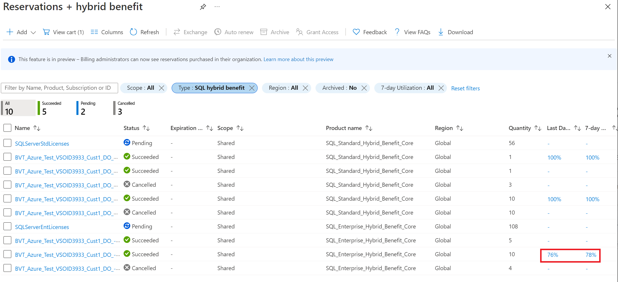 将显示所有预留和许可证分配的列表。 如果您想将结果筛选为仅限分配许可证,请为 SQL 混合权益设置筛选器。