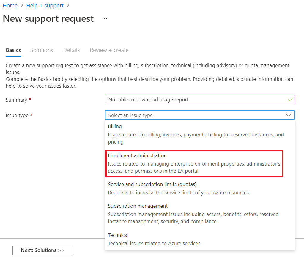 若要创建 Azure 支持票证,组织帐户必须具有 EA 管理员角色或合作伙伴管理员角色。