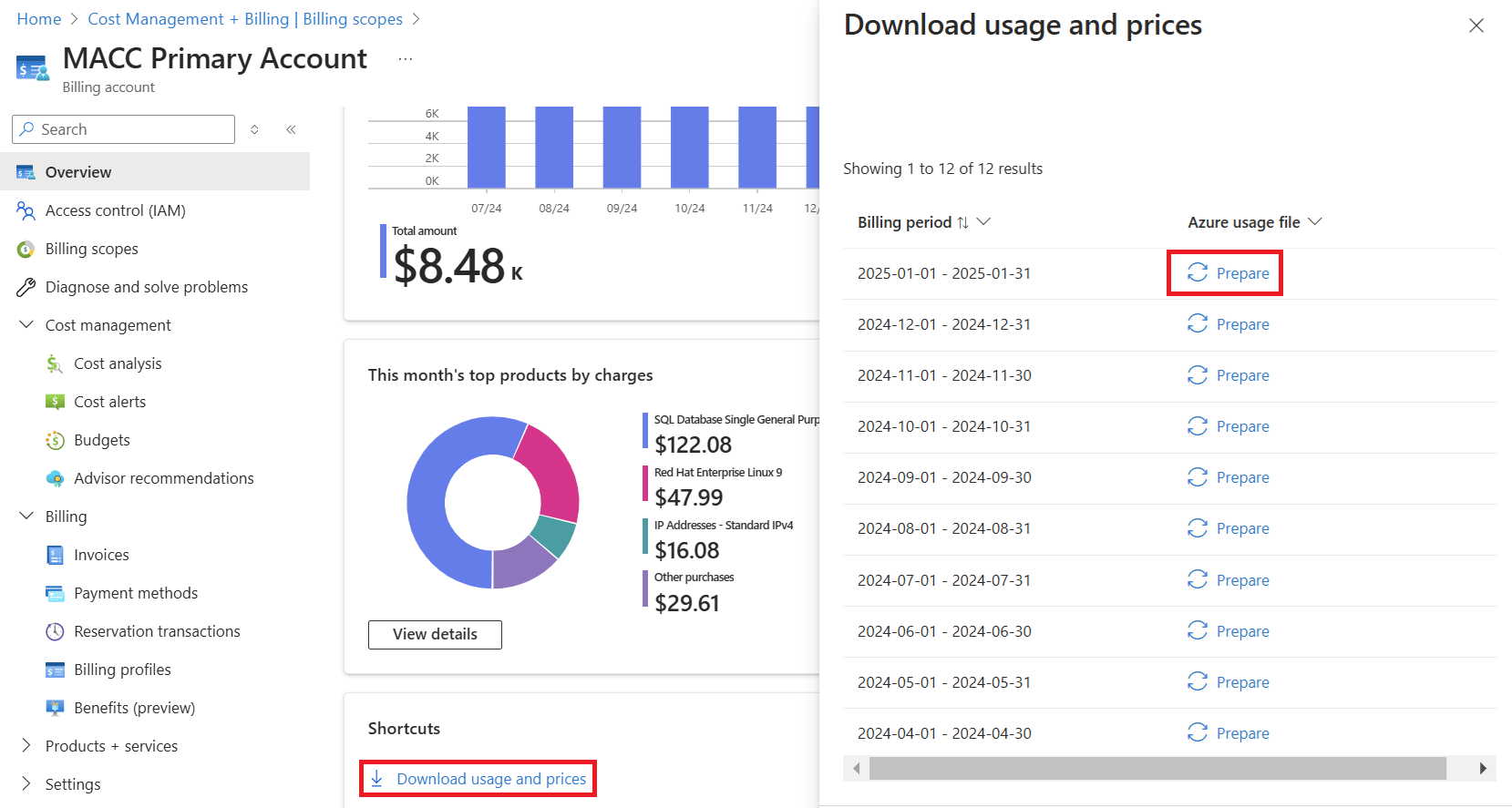 在发票列表视图中,单击任何发票末尾的省略号,然后选择“准备Azure使用情况文件”。