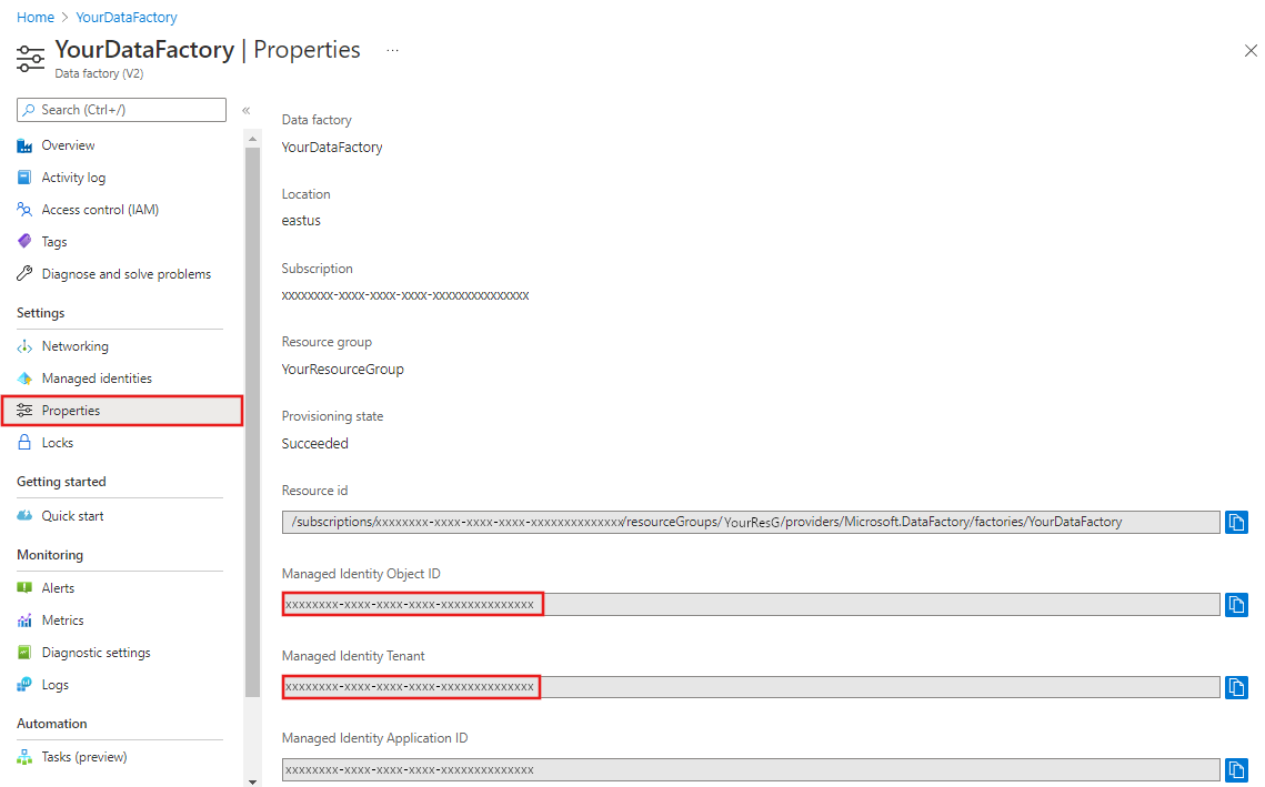 可以从 Azure 门户 -> 数据工厂 ->“属性”找到托管标识信息。