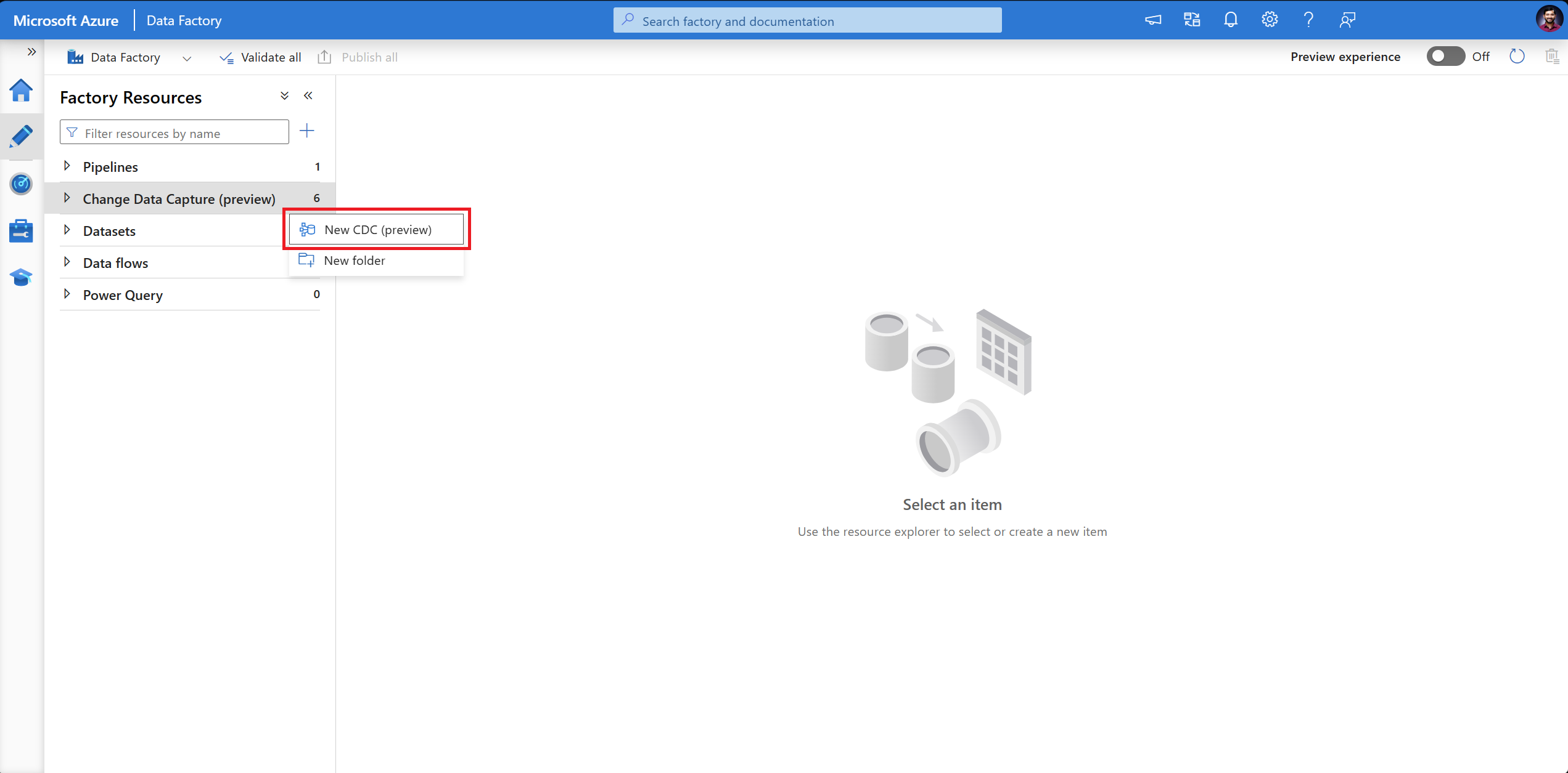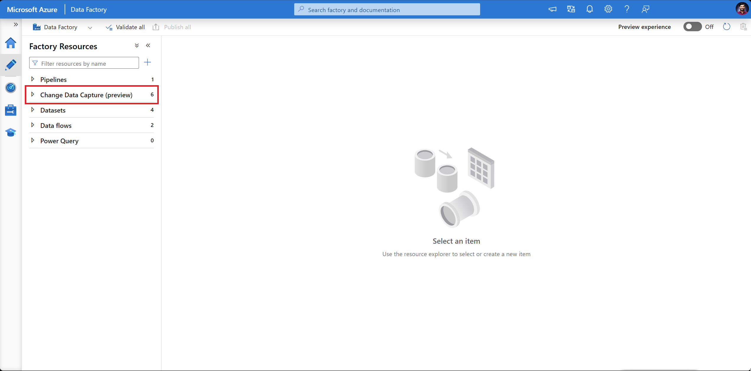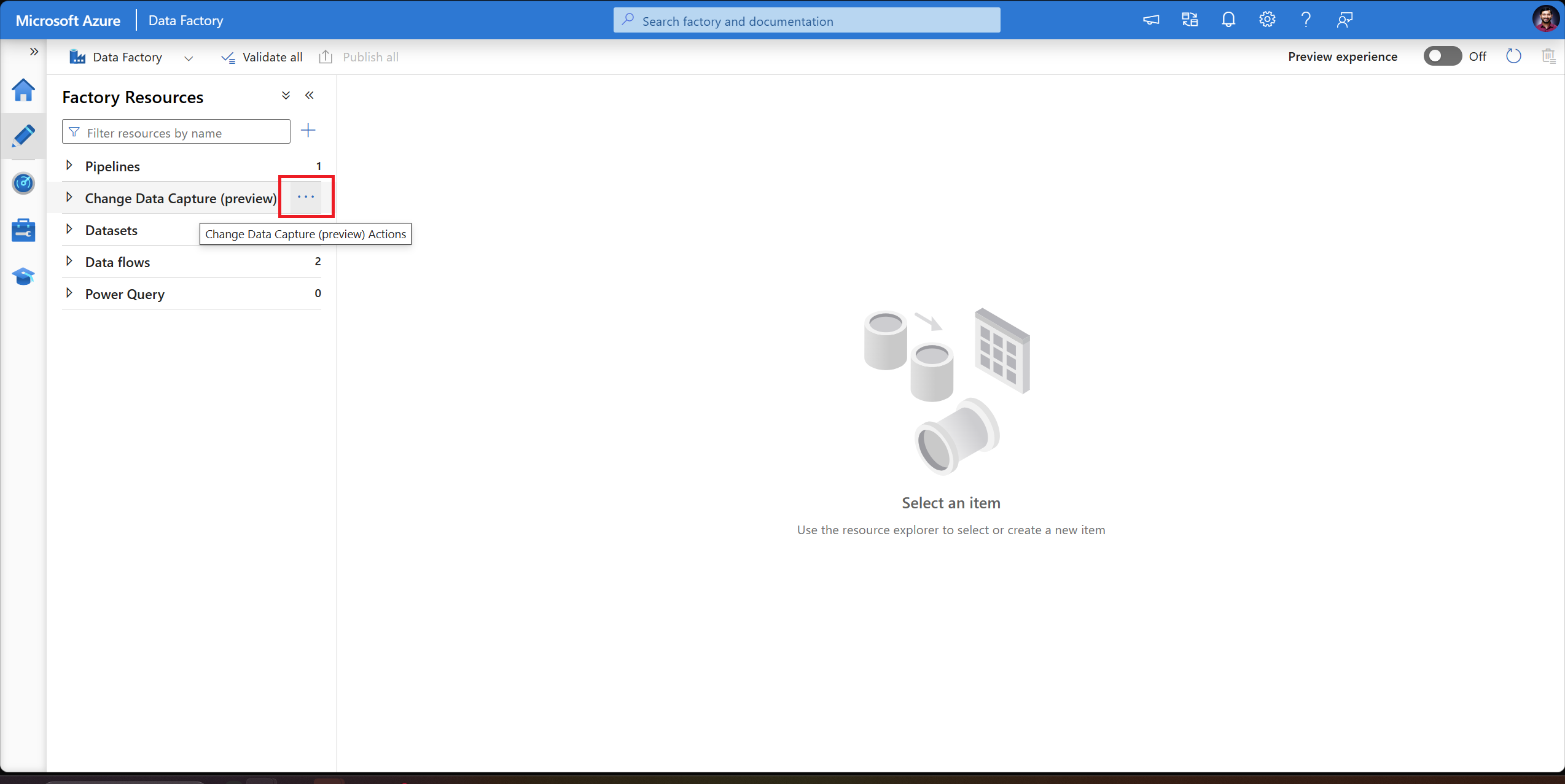 转到数据工厂中的“创作”窗格。 在“管道”下,会出现一个名为“变更数据捕获(预览版)”的新顶级项目。