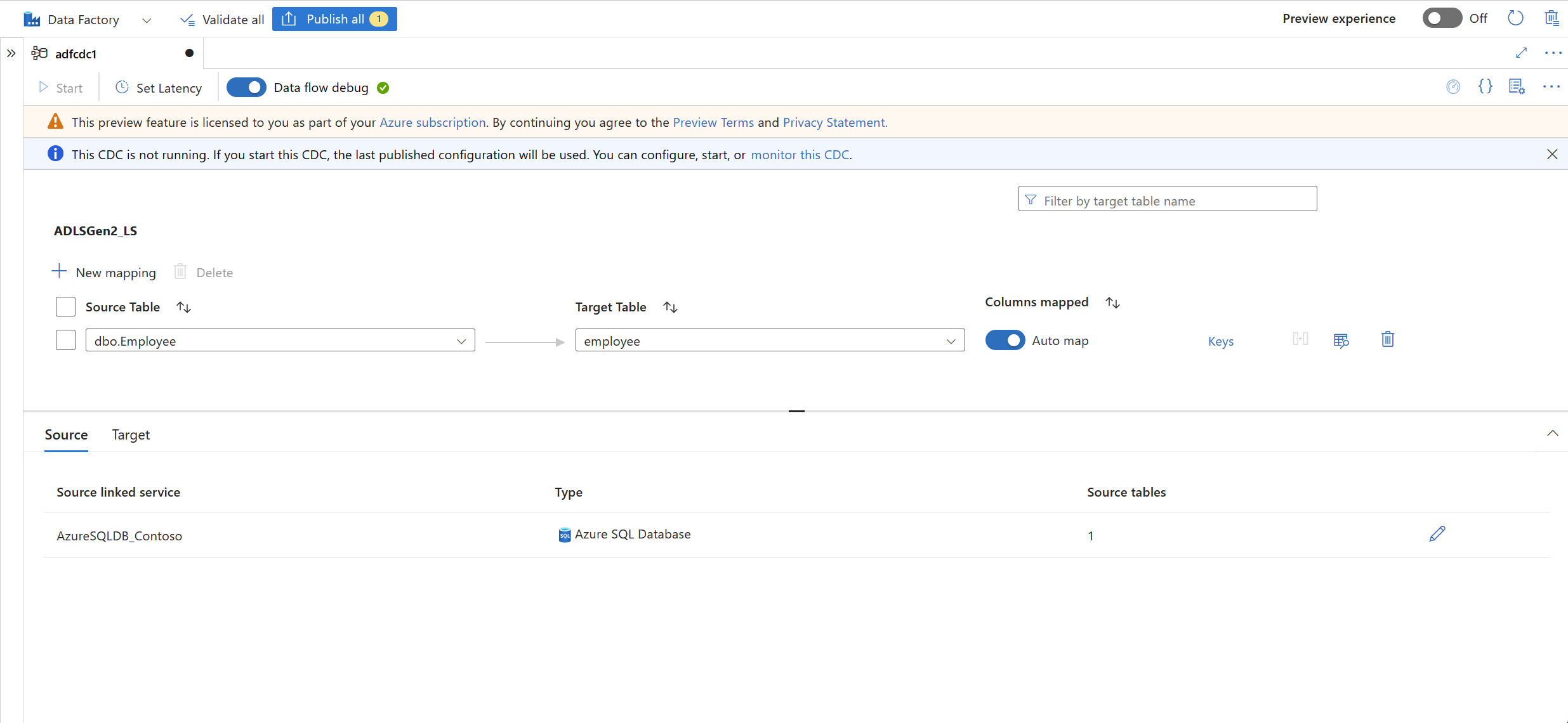 仅当“自动映射”开关处于打开状态时,架构演变才有效。 若要了解如何编辑列映射或包含转换,请参阅使用变更数据捕获资源捕获已更改的数据。
