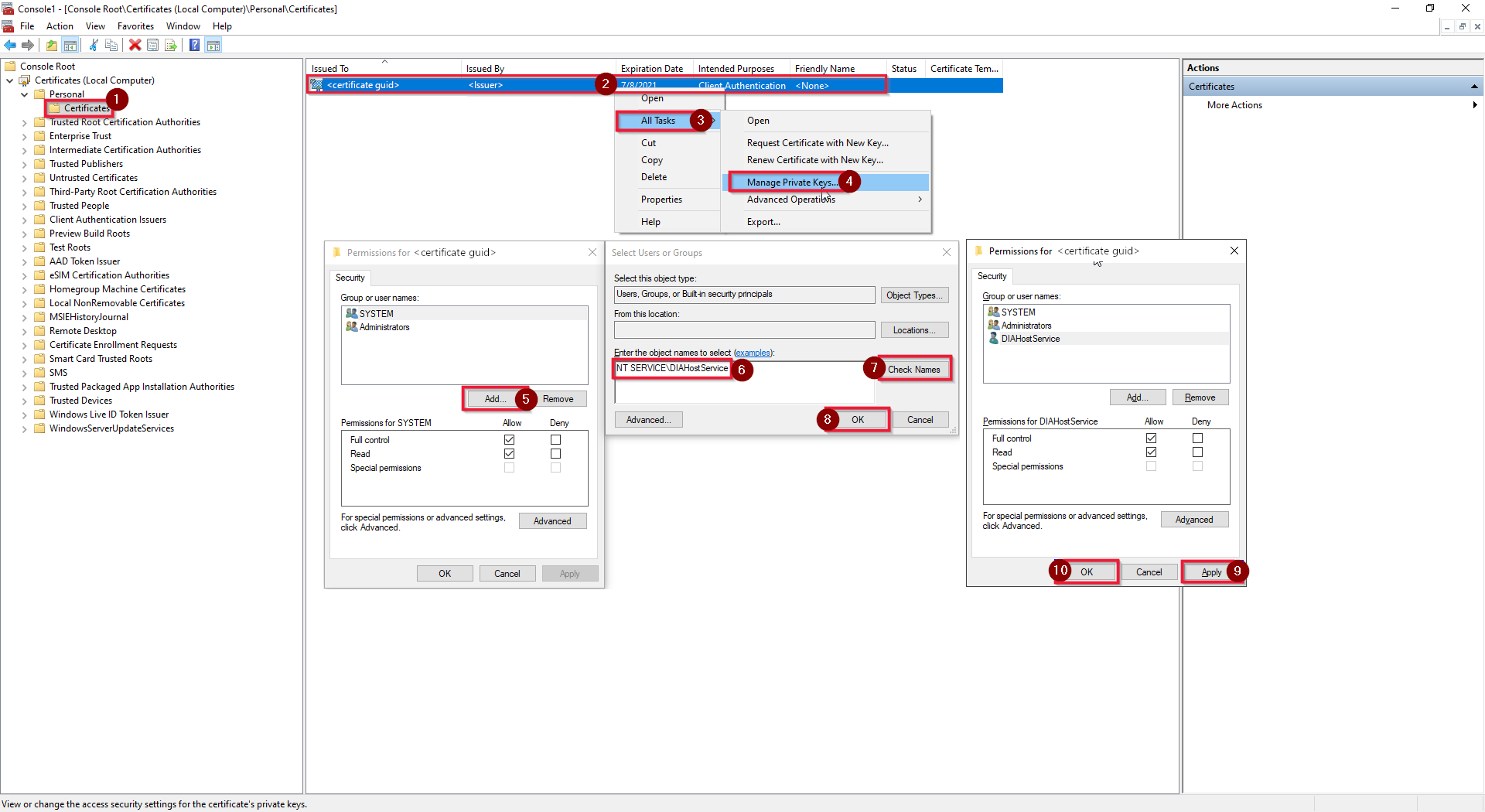 若要解决此问题,你需要将自承载集成运行时服务帐户 (NT SERVICE\DIAHostService) 添加到私钥权限中。 你可以应用以下步骤: