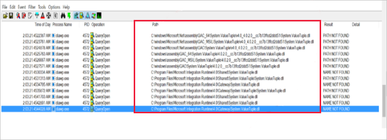 前面的错误消息告诉我们 DLL System.ValueTuple 不在“全局程序集缓存”(GAC) 文件夹中,不在 C:\Program Files\Microsoft Integration Runtime\4.0\Gateway 文件夹中,也不在 C:\Program Files\Microsoft Integration Runtime\4.0\Shared 文件夹中。