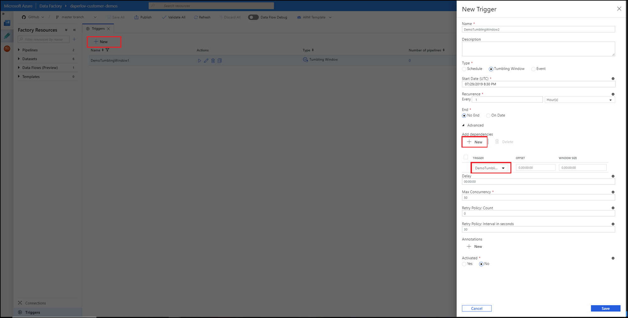 若要创建对触发器的依赖项,请选择“触发器”“高级”>“新建”>。 然后,选择要依赖的具有适当偏移和大小的触发器。 选择“完成”并发布更改,使依赖项生效。