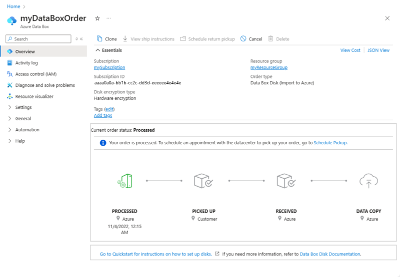 myDataBoxOrderPSTest DataBox DeviceOrdered 7/7/2020 12:37:16 AM ChinaEast2 myResourceGroup
