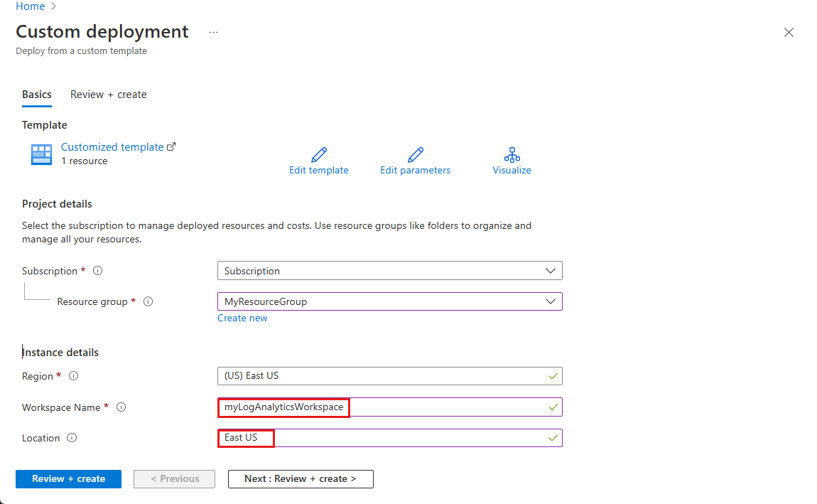 设置 值 订阅 选择 Azure 订阅。 资源组 选择你的资源组。 区域 选择你的区域。 警报名称 保留为默认值。 安全团队电子邮件 输入所需的电子邮件地址。 公司域名 输入所需的域名。 工作区名称 输入工作区名称。 在此示例中,工作区名称为 myLogAnalyticsWorkspace。 选择“查看 + 创建”,然后在通过验证后选择“创建” 。