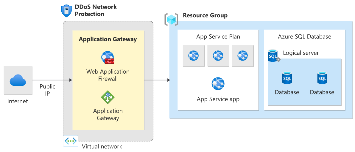 在此体系结构示意图中,已在虚拟网络上启用 DDoS 网络保护。 虚拟网络中的所有公共 IP 将得到第 3 层和第 4 层 DDoS 防护。 要获得第 7 层防护,请部署 WAF SKU 中的应用程序网关。 有关此参考体系结构的详细信息,请参阅 Azure 上的 Windows N 层应用程序。