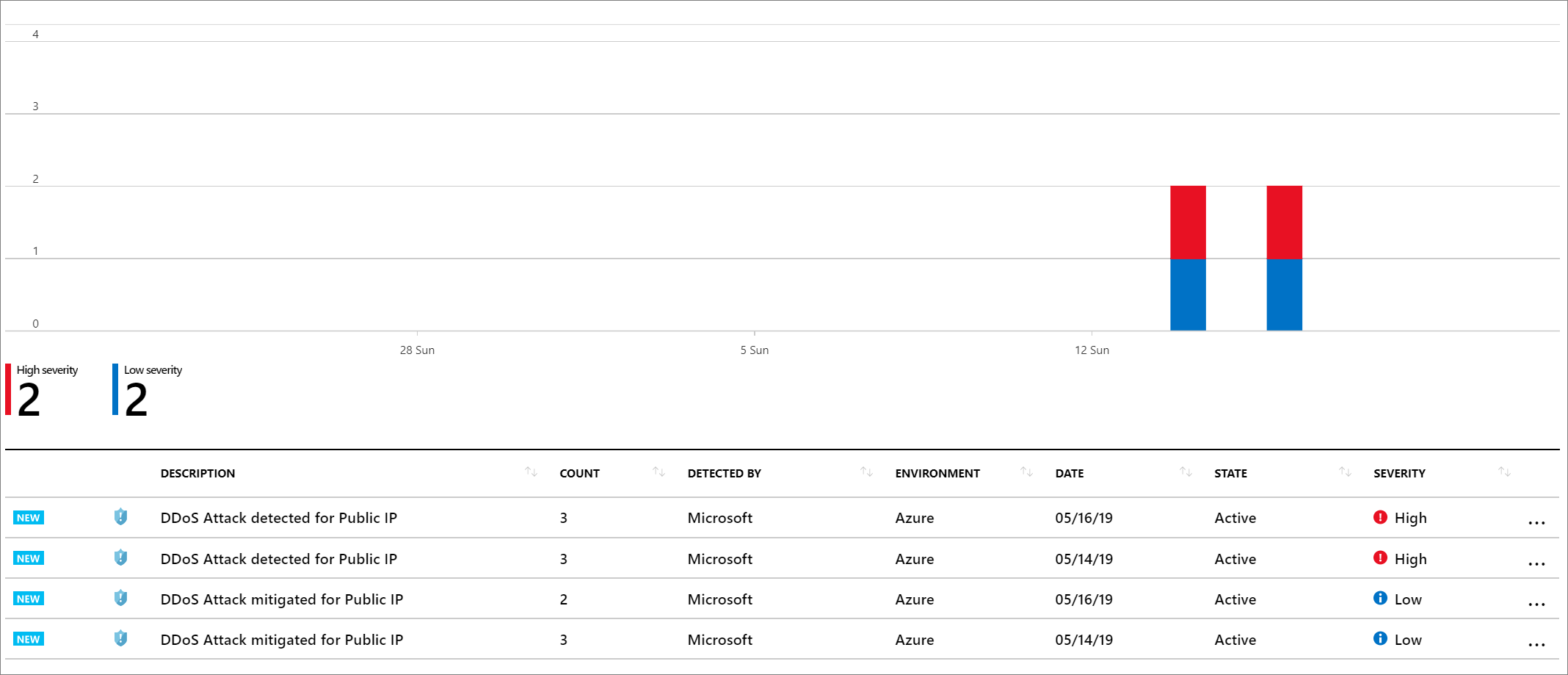 要查看警报,请在 Azure 门户中打开 Defender for Cloud,然后选择“安全警报”。 以下屏幕截图显示了 DDoS 攻击警报的示例。