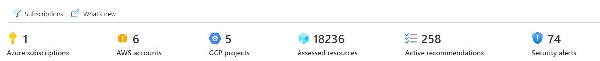- 连接的云帐户的高级数字,显示主磁贴中信息的上下文,以及评估的资源数、活动建议和安全警报的数量。 选择评估的资源编号以访问 资产清单。
