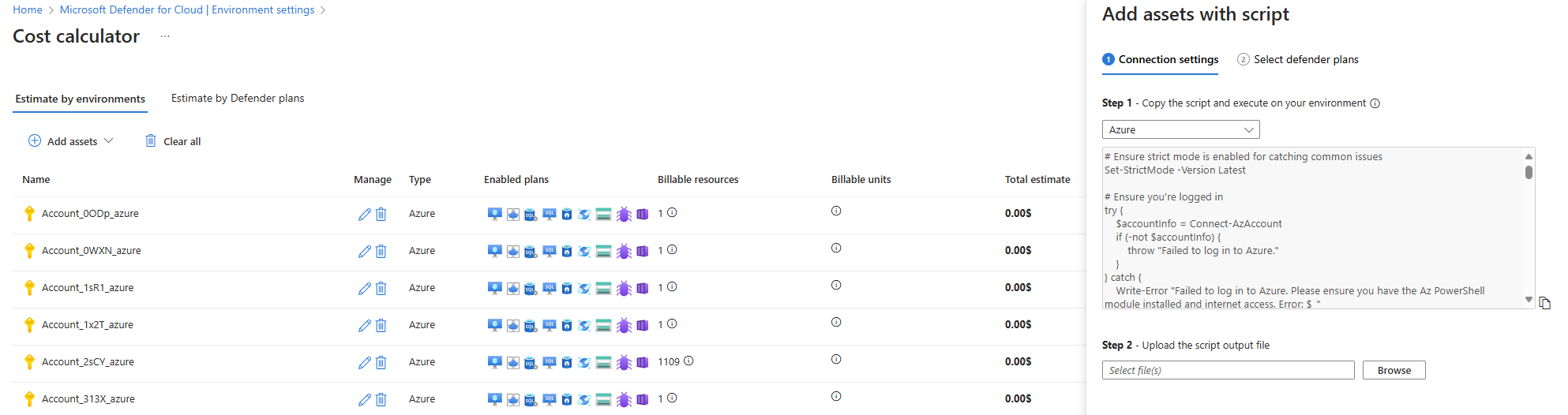 - 从载入环境添加资产: 建议 - 从已载入到 Defender for Cloud 的环境中添加资产。 此方法涵盖 Azure 的所有计划,其工作速度比脚本选项更快。