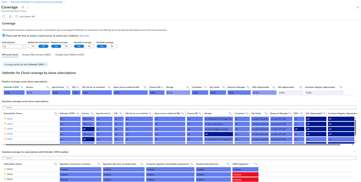 - 覆盖范围工作簿 - 跟踪各环境和订阅的 Defender for Cloud 计划和扩展的覆盖范围。