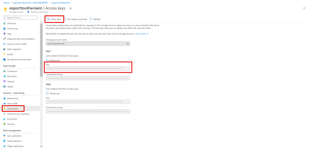 创建存储帐户并转到资源后,在菜单中选择“访问密钥”。