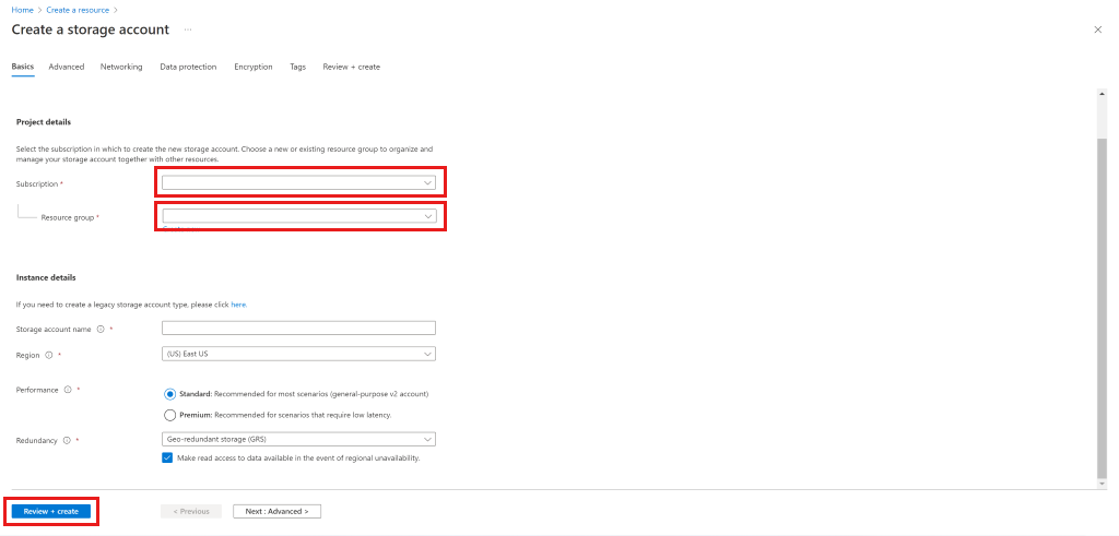 输入存储帐户的详细信息,选择“查看并创建”,然后选择“创建”。