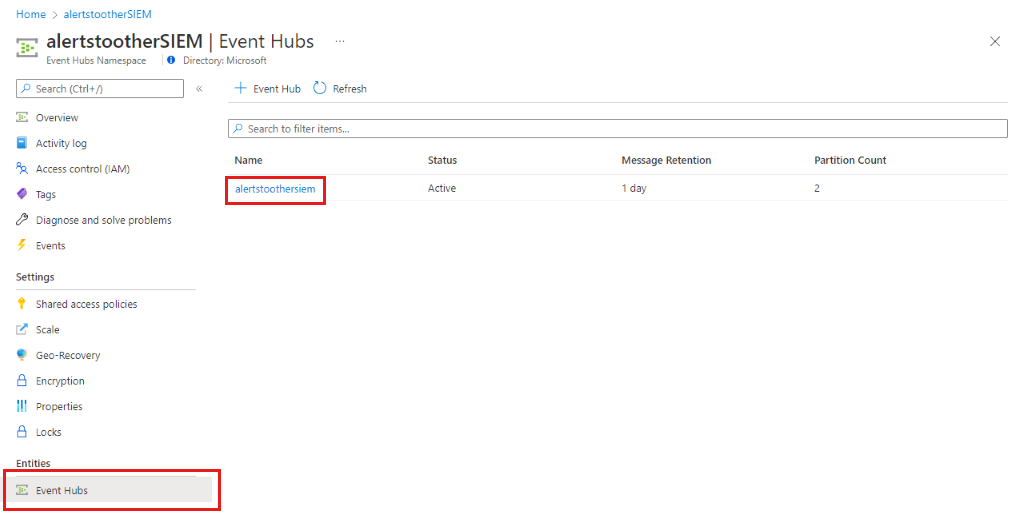 - 在创建的命名空间中,选择“+ 事件中心”。