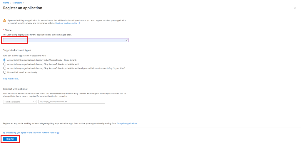 输入应用程序的唯一名称并选择“注册”。