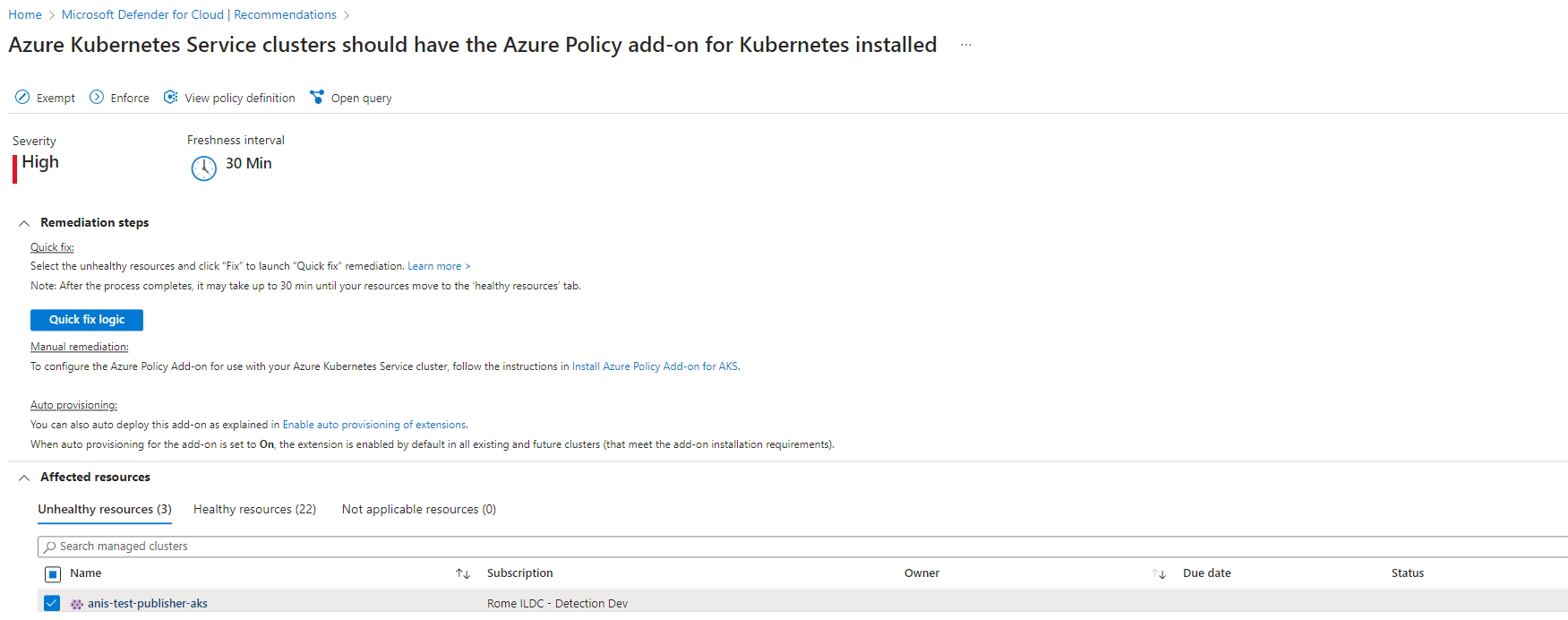 可以通过“建议”页在现有 Kubernetes 群集上手动配置适用于 Kubernetes 的 Azure Policy。 启用后,强化建议将变为可用(其中一些建议需要其他配置才能正常工作)。