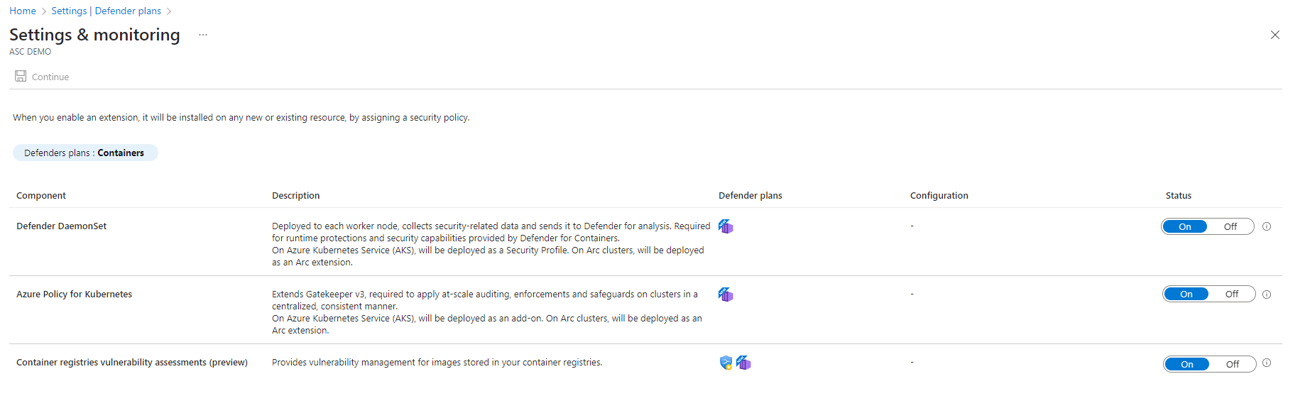 如果启用 Microsoft Defender for Containers,则默认情况下会在相关订阅中为 Azure Kubernetes 服务和已启用 Azure Arc 的 Kubernetes 群集启用“适用于 Kubernetes 的 Azure Policy”设置。 如果在初始配置中禁用该设置,则可以在之后手动启用它。