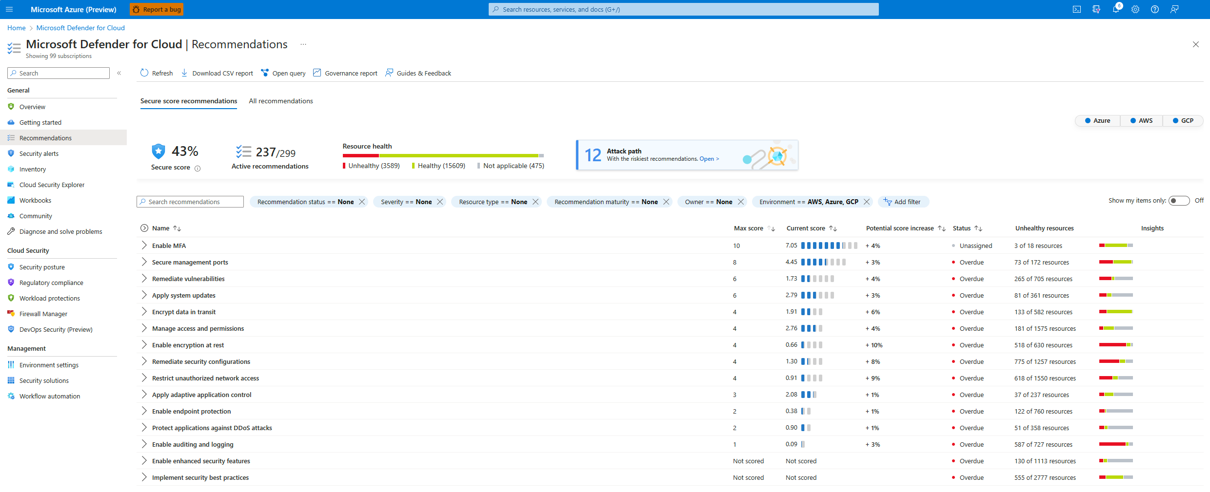 Defender for Cloud 中的“安全状况”页面显示环境的整体安全分数以及单独每个环境的安全分数。