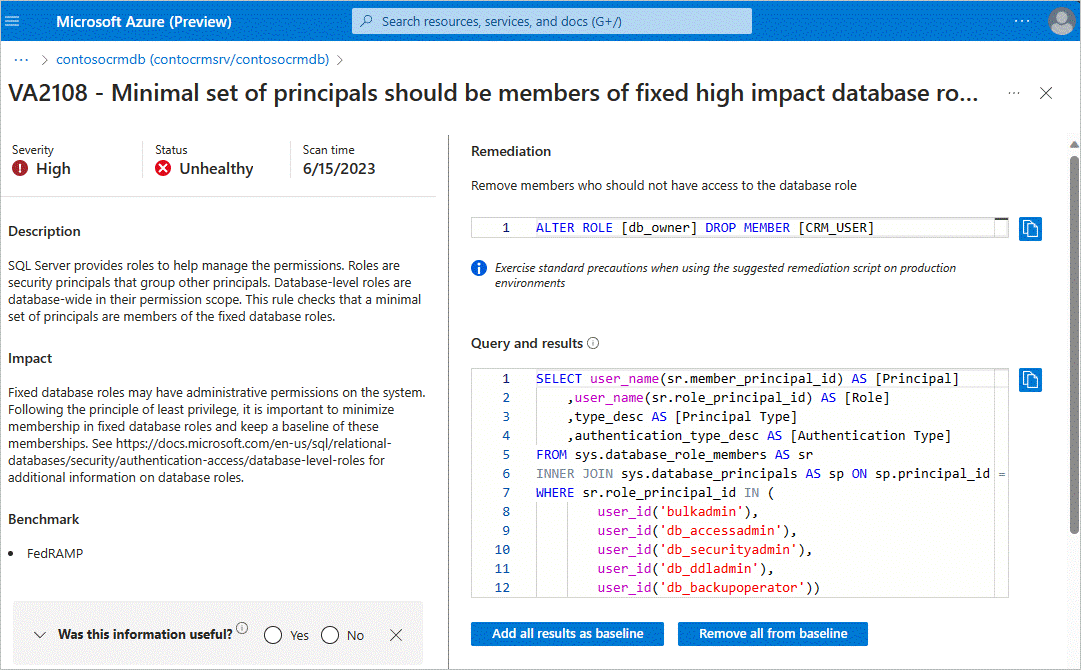 选择显示查询和结果以对每个受影响的数据库进行大规模基线设置。