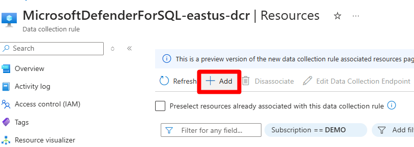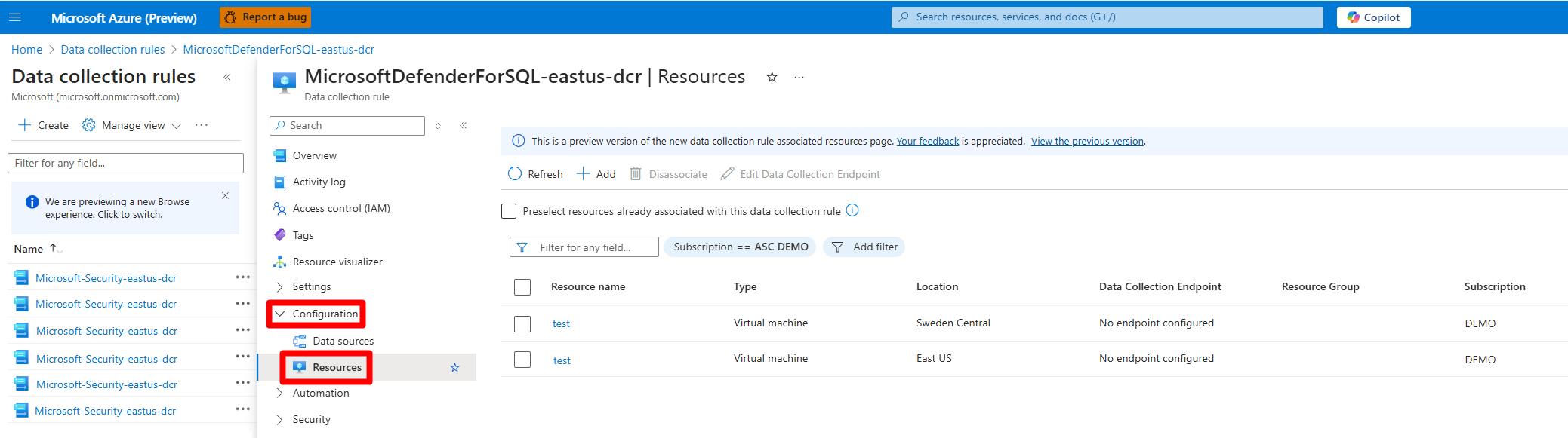 MicrosoftDefenderForSQL-region-dcr。选择“配置”>“资源”。