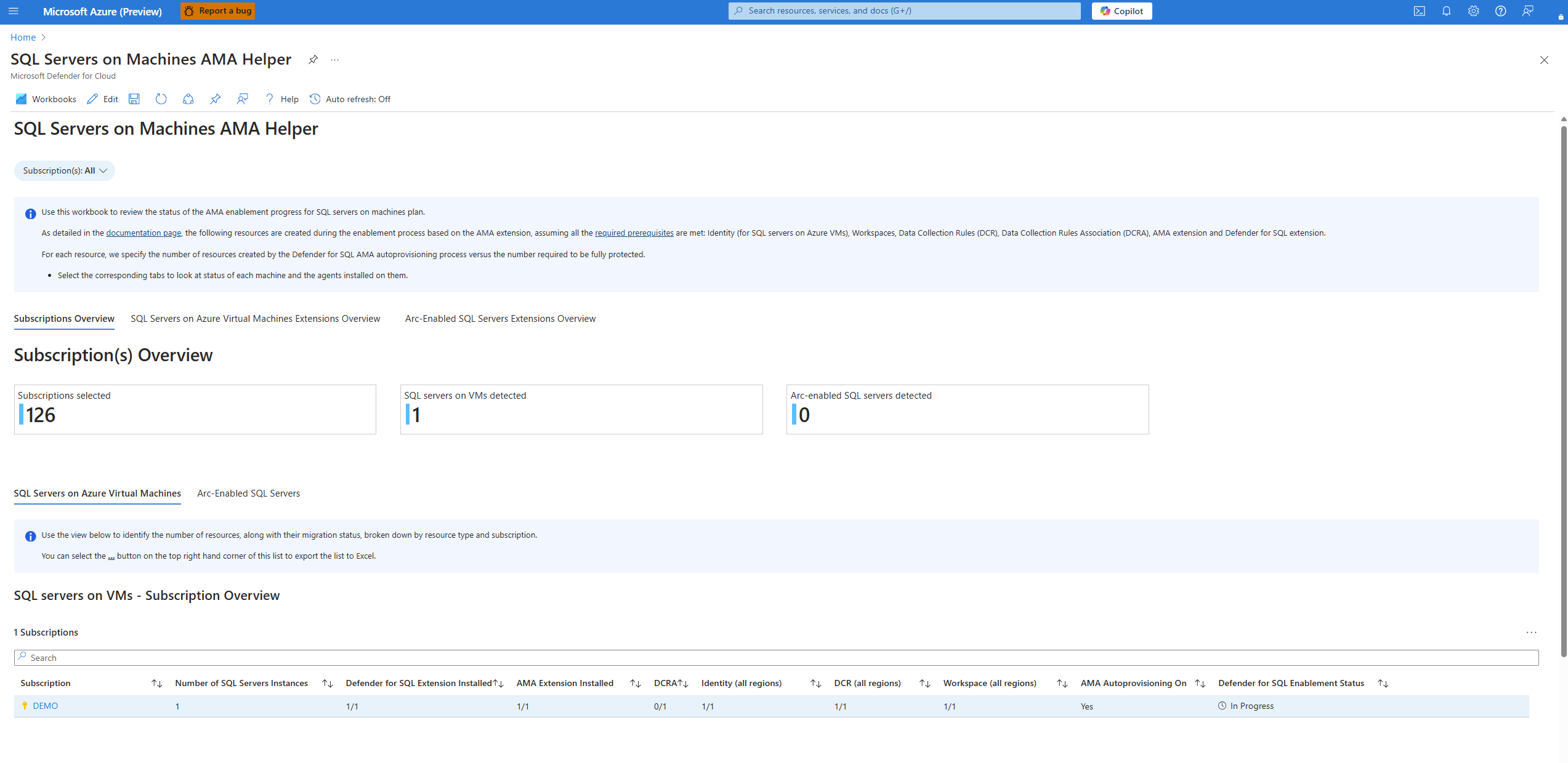 若要识别哪些订阅存在配置错误,请使用机器上的 SQL 服务器 AMA 助手工作簿。