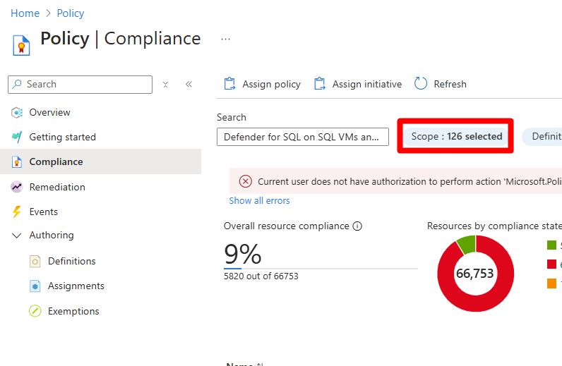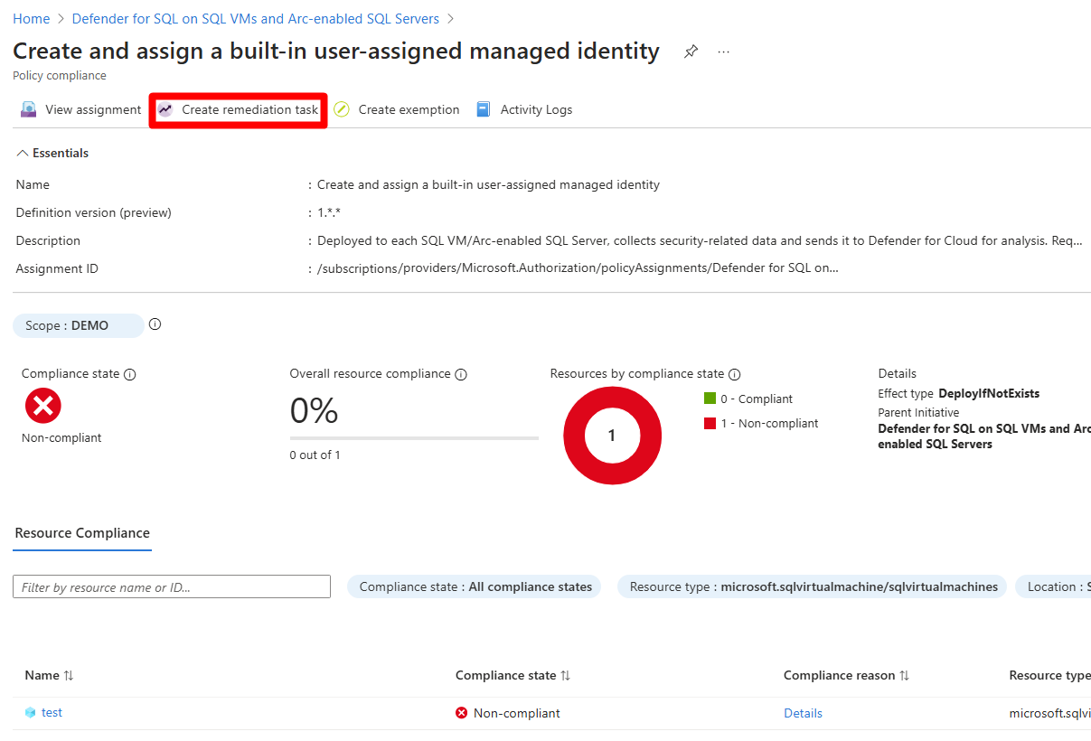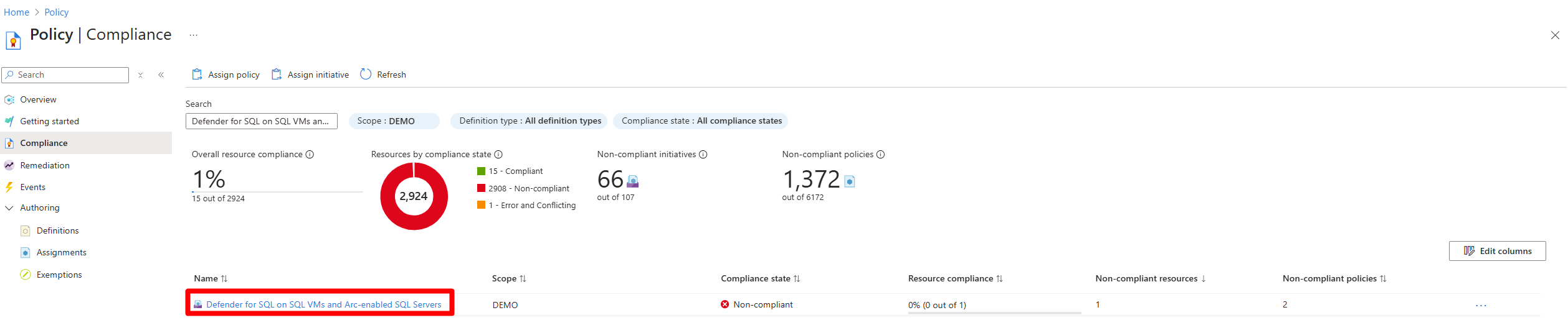 在订阅级别解决错误配置后,请在资源级别解决错误配置,包括 DCRA 配置错误,以及不完整的 AMA 或 Defender for SQL 扩展部署。