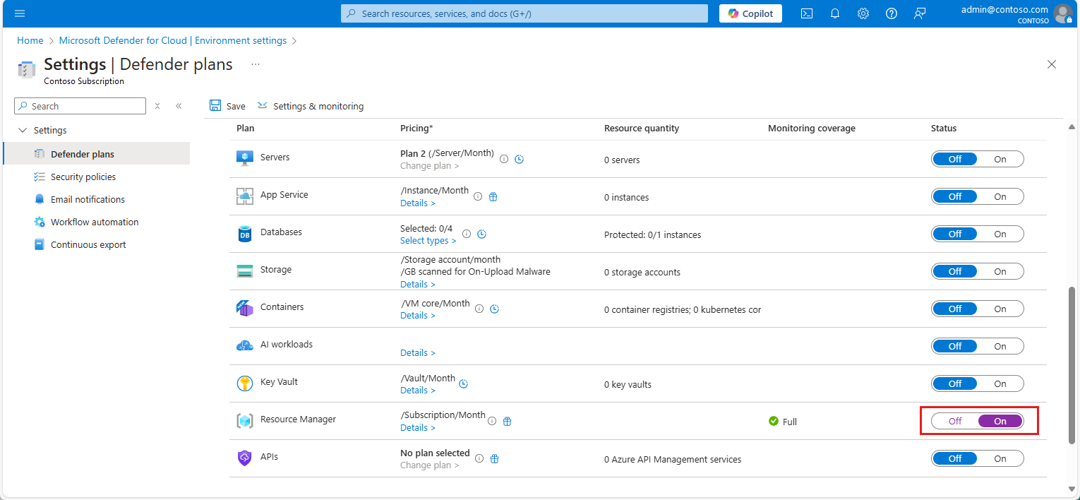 若要在订阅上启用 Defender for Resource Manager 计划,请执行以下操作: