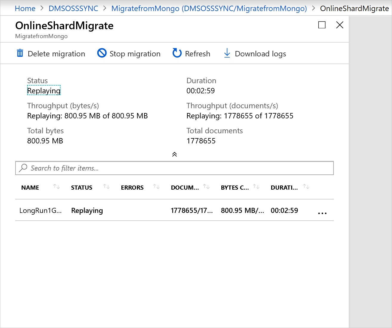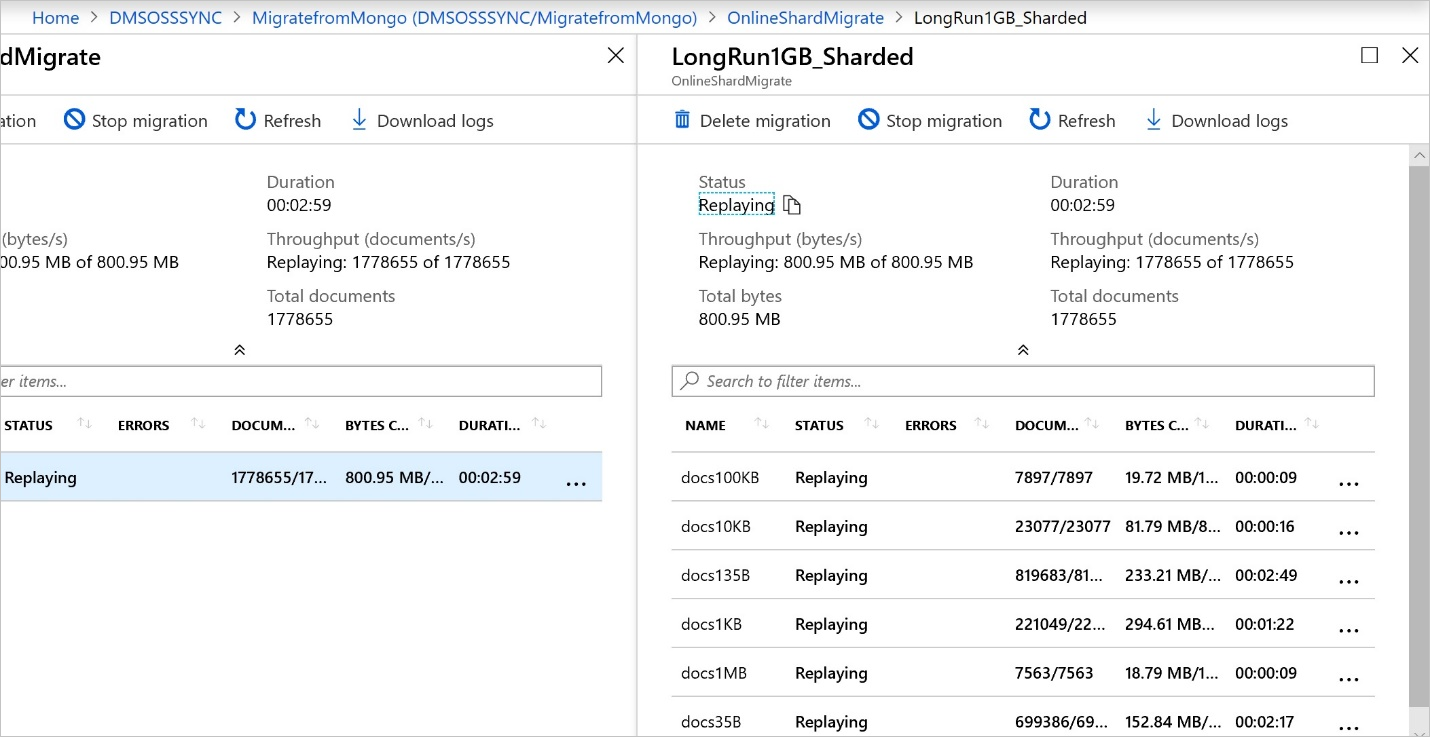 可以使用 Azure 数据库迁移服务将数据库从 MongoDB 的本地或云实例联机(在几乎不停机的情况下)迁移到 Azure Cosmos DB for MongoDB。
