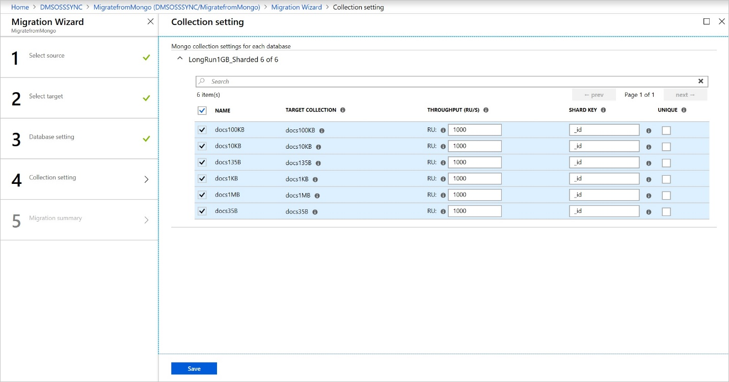 可以指定希望集合使用的 RU 数量。 在大多数情况下,介于 500(分片集合最少需要 1000 个 RU)与 4000 之间的值应该足够。 Azure 数据库迁移服务建议使用根据集合大小设置的智能默认值。