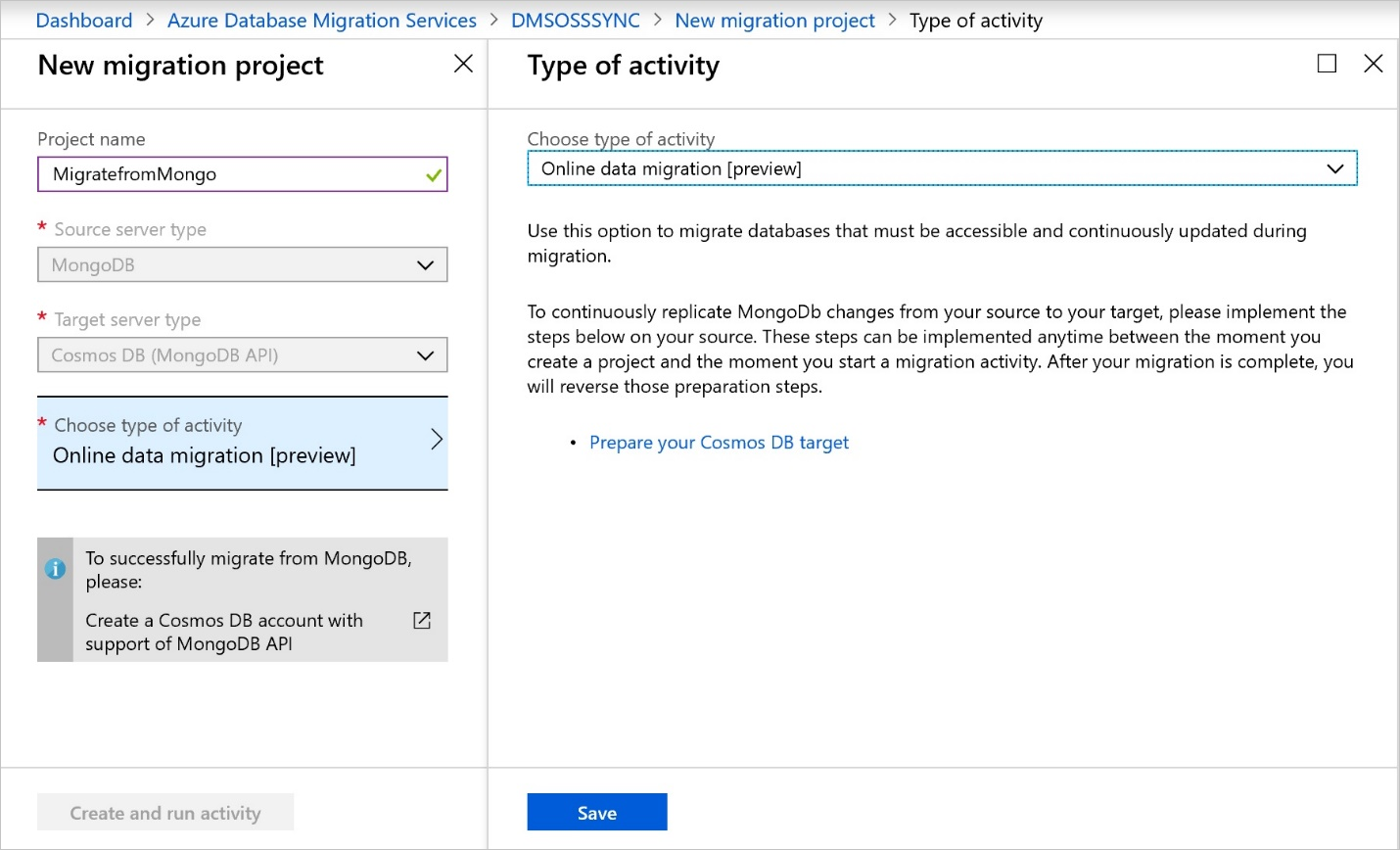 在“新建迁移项目”屏幕上指定项目名称,在“源服务器类型”文本框中选择“MongoDB”,在“目标服务器类型”文本框中选择“Azure Cosmos DB for MongoDB”,然后在“选择活动类型”中选择“联机数据迁移 [预览]”。