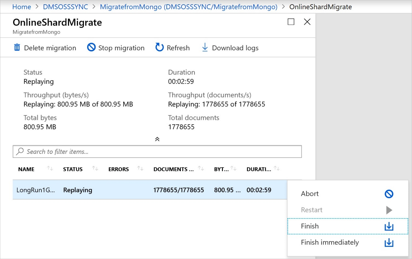 源中的所有文档都出现在 Azure Cosmos DB 目标中之后,请从迁移活动的上下文菜单中选择“完成”以完成迁移。