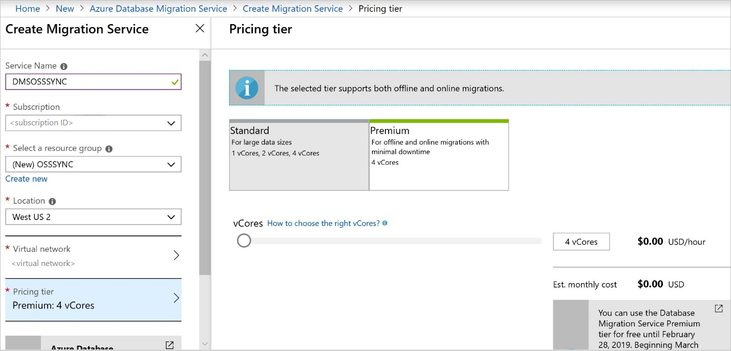 使用 Azure 数据库迁移服务执行联机迁移需要基于“高级”定价层创建实例。