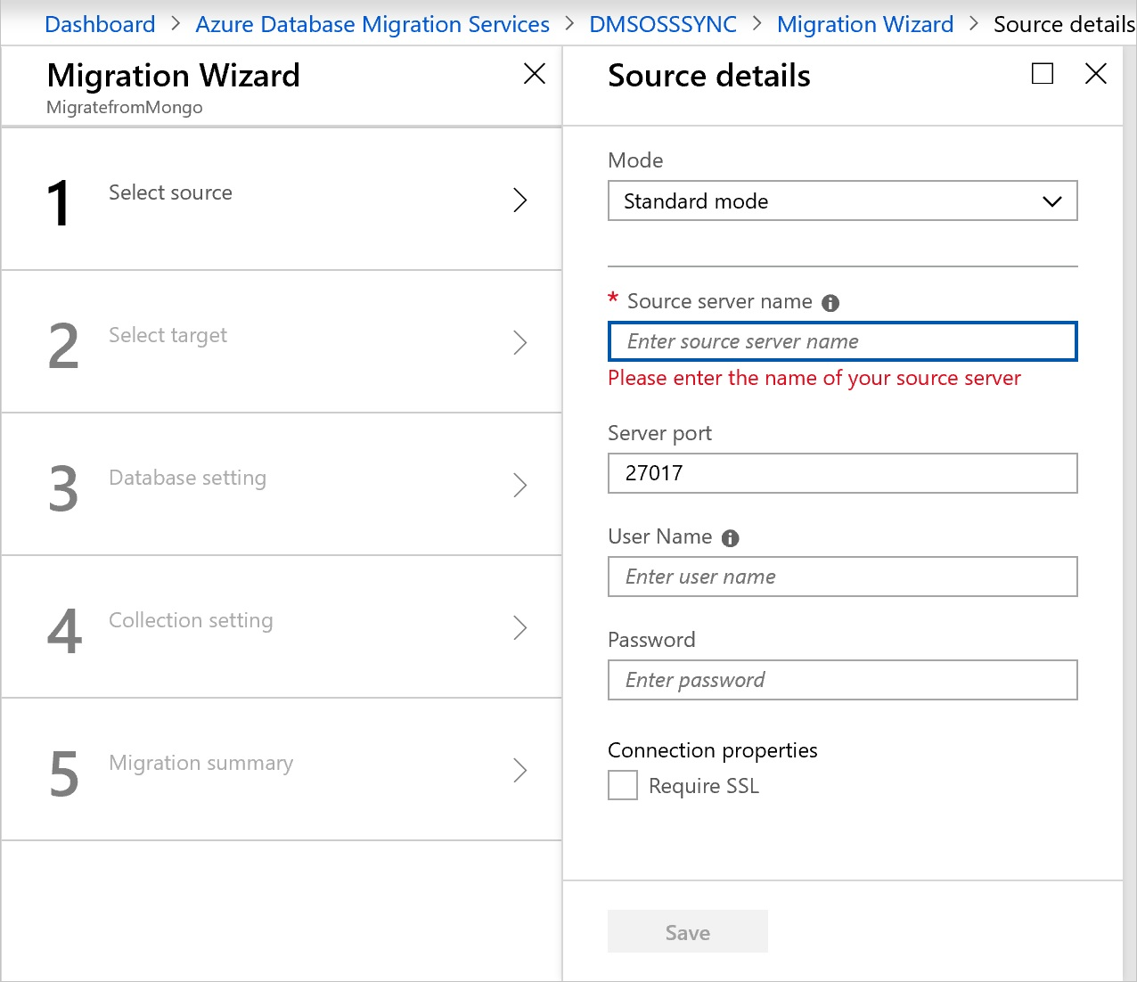 在“源详细信息” 屏幕上,指定源 MongoDB 服务器的连接详细信息。