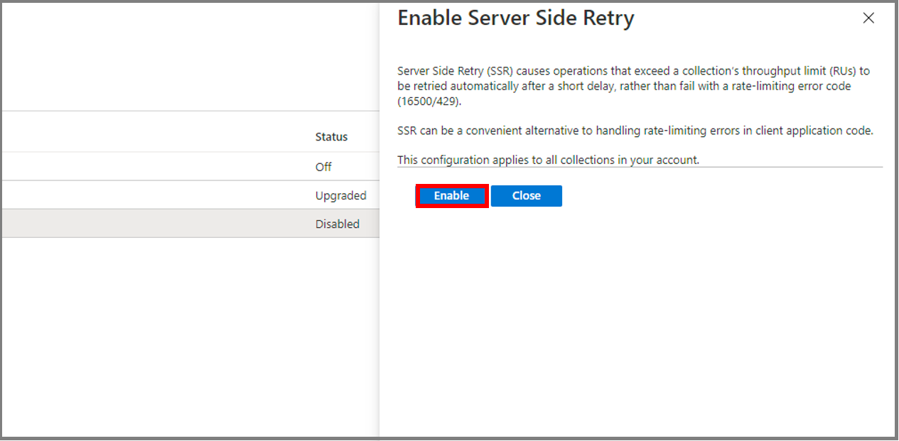 你可在 Azure Cosmos DB 门户的“功能”边栏选项卡中找到服务器端重试功能