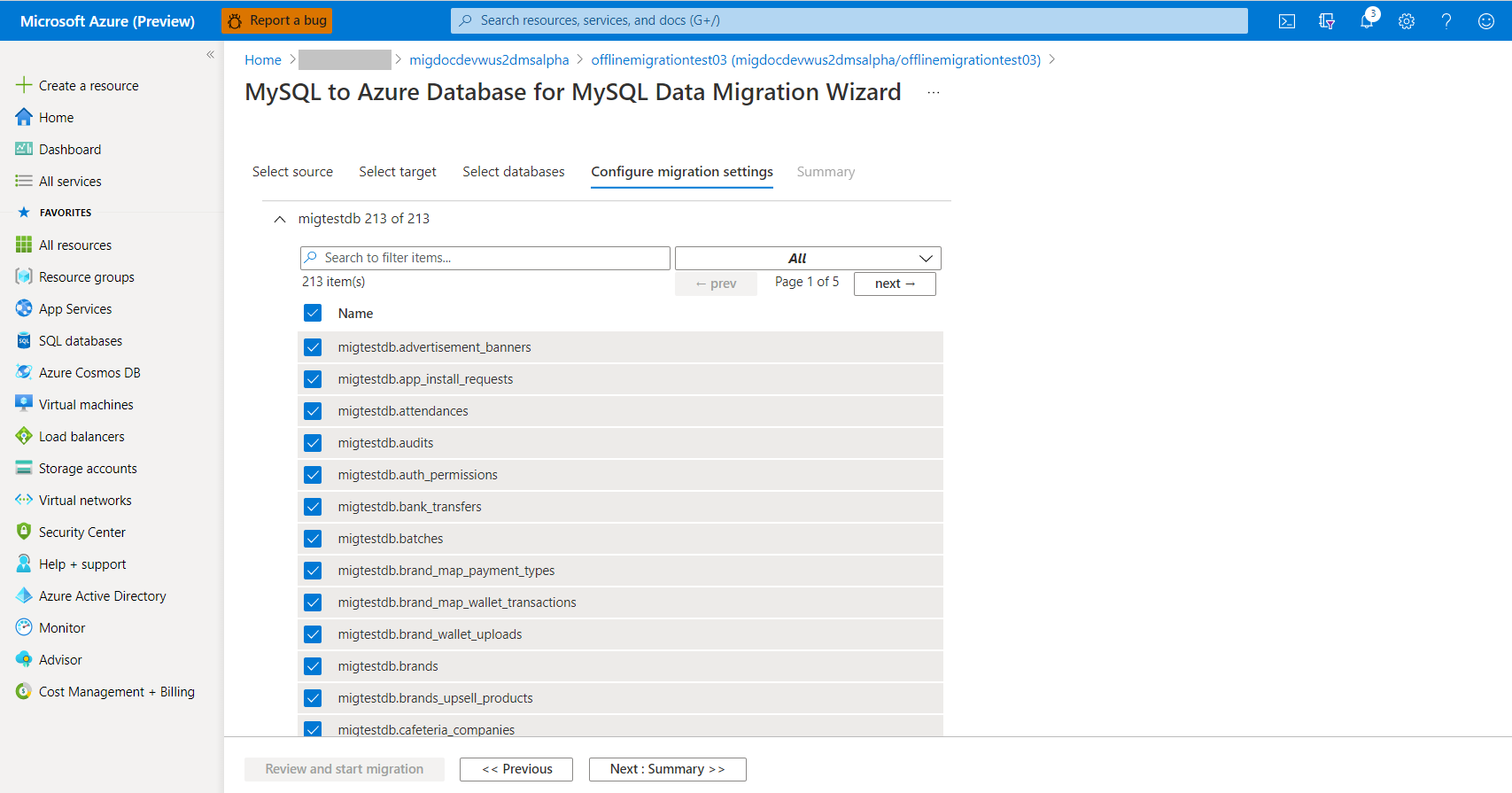 在 “配置迁移设置” 屏幕上,选择要成为迁移的一部分的表,然后选择“ 下一步:摘要 >>”。 如果目标表具有任何数据,则默认情况下不会选择它们,但你可以显式选择它们,并在开始迁移之前将其截断。
