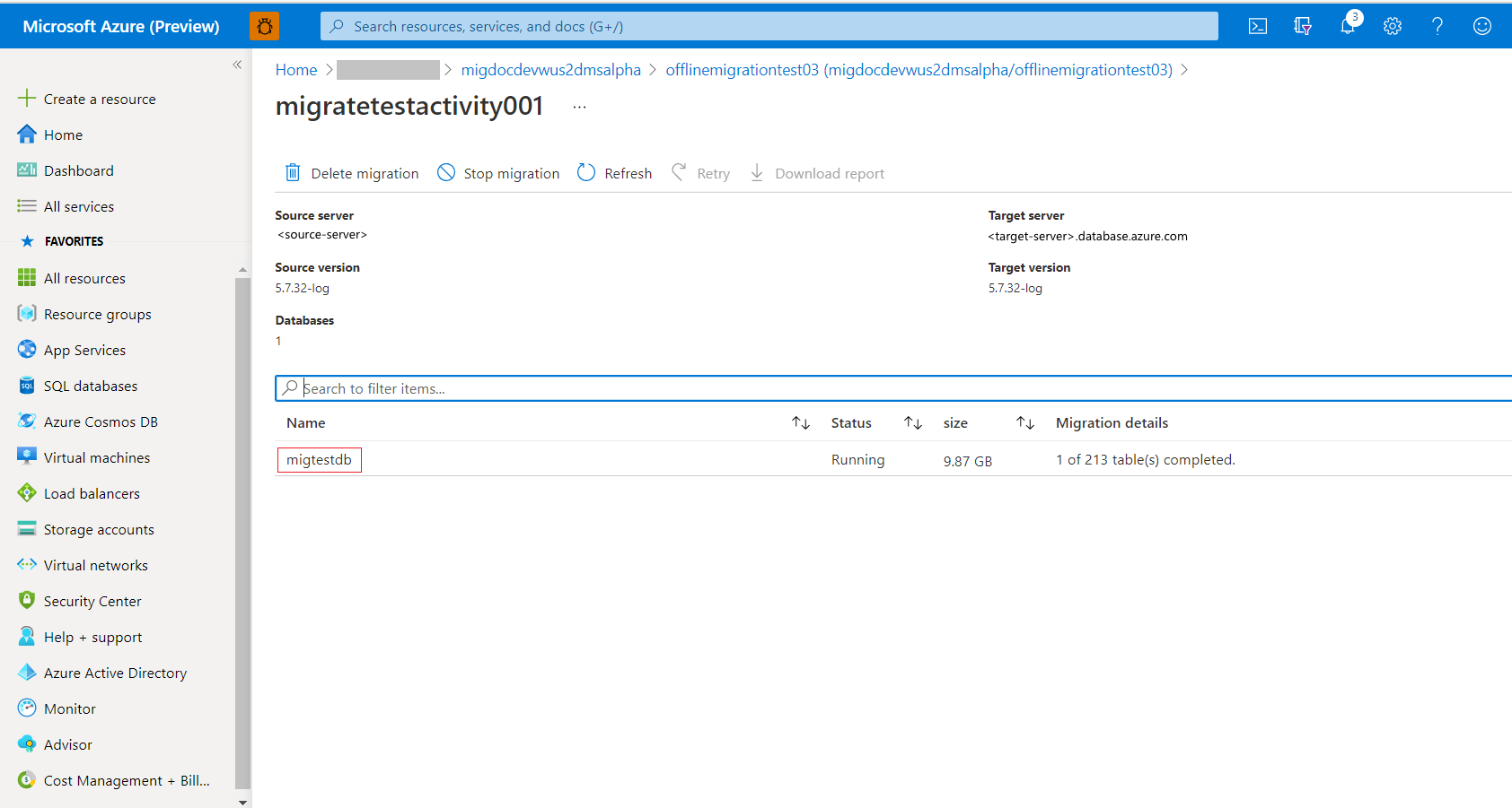 可以使用 Azure 数据库迁移服务通过高速数据迁移功能执行从外部 MySQL 实例到 Azure Database for MySQL 的无缝迁移。 在本教程中,我们使用 Azure 数据库迁移服务中的脱机迁移活动,将示例数据库从 MySQL 5.7 的本地实例迁移到 Azure Database for MySQL(v5.7)。 虽然本文假设源为 MySQL 数据库实例,目标为 Azure Database for MySQL,但只需更改源服务器名称和凭据,本文即可用于在 Azure Database for MySQL 之间迁移。 此外,还支持从较低版本的 MySQL 服务器(v5.6 及更高版本)迁移到更高版本。