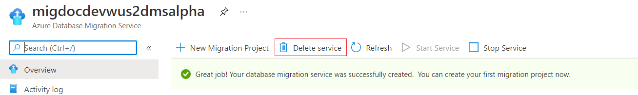 从搜索结果中选择你的迁移服务实例,然后选择“删除服务”。