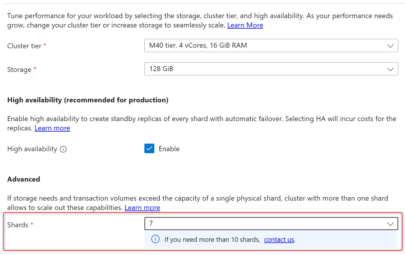 如果在群集上需要 10 个以上的物理分片,请开具支持票证。