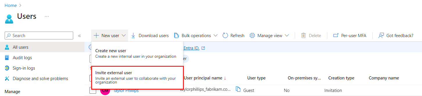 选择 “新建用户 ”,然后选择 “邀请外部用户”。