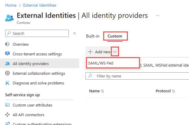 步骤 3:在 Microsoft Entra 外部 ID 中配置 SAML/WS-Fed IdP 联合身份验证