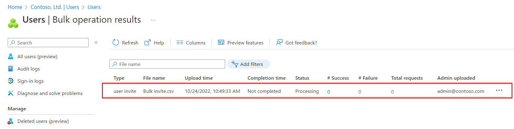 文件通过验证以后,请选择“提交”,开始用于添加邀请的 Azure 批量操作。