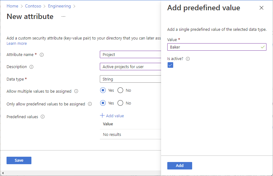 如果“仅允许分配预定义值”为“是”,请选择“添加值”以添加预定义值。