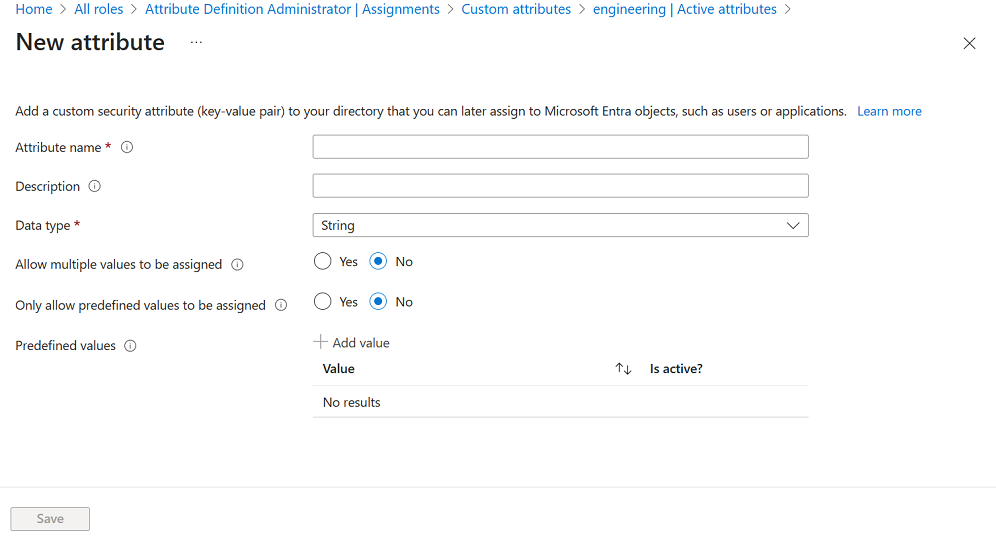 如果选择“是”,则要求从预定义值列表中为此自定义安全属性分配值。 如果选择“否”,则允许为此自定义安全属性分配用户定义的值或可能的预定义值。